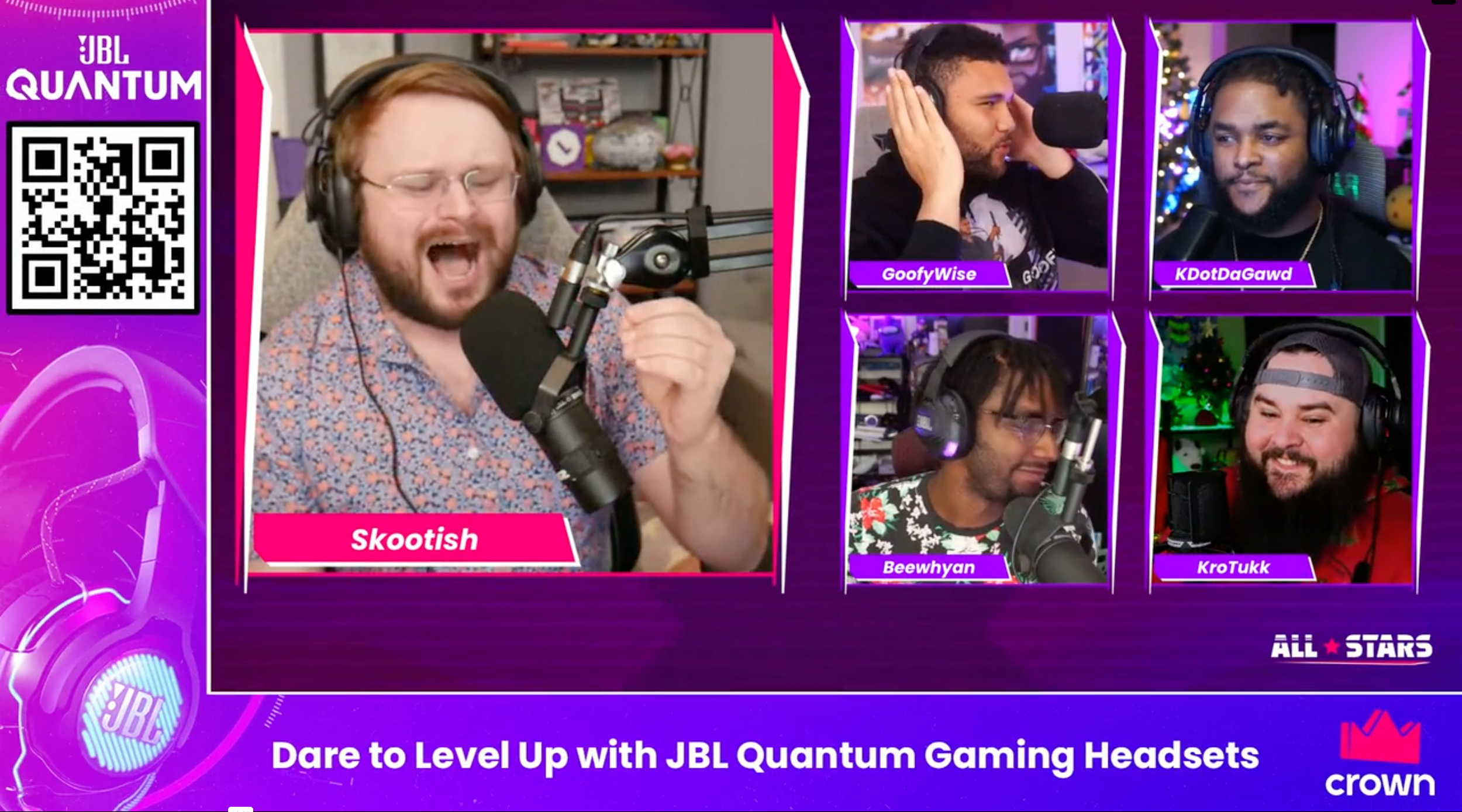 Twitch.tv [AMAZON] - Live-Stream Gaming Competition (above): CROWN ALL STARS —I produced a brand new competitive live-stream series called ALL-STARS, where celebrity gamers competed in games like Minecraft Dungeons, Angry Birds with Friends, and Assassin’s Creed: Valhalla (links below). I also wrote a commercial for JBL Headphones for the series. Each live broadcast garnered around 500k views, with a huge amount of viewer engagement in Twitch’s interactive chat module.
